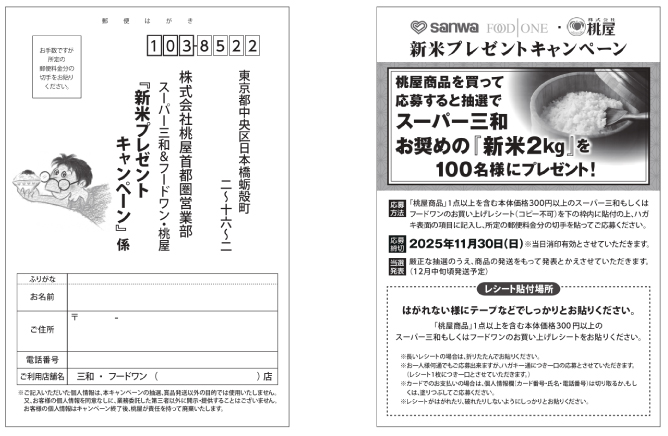 応募先 | 〒103-8522 東京都中央区日本橋蛎殻町2-16-2 株式会社 桃屋 首都圏統括営業部 スーパー三和&フードワン・桃屋 『新米プレゼントキャンペーン』係 |