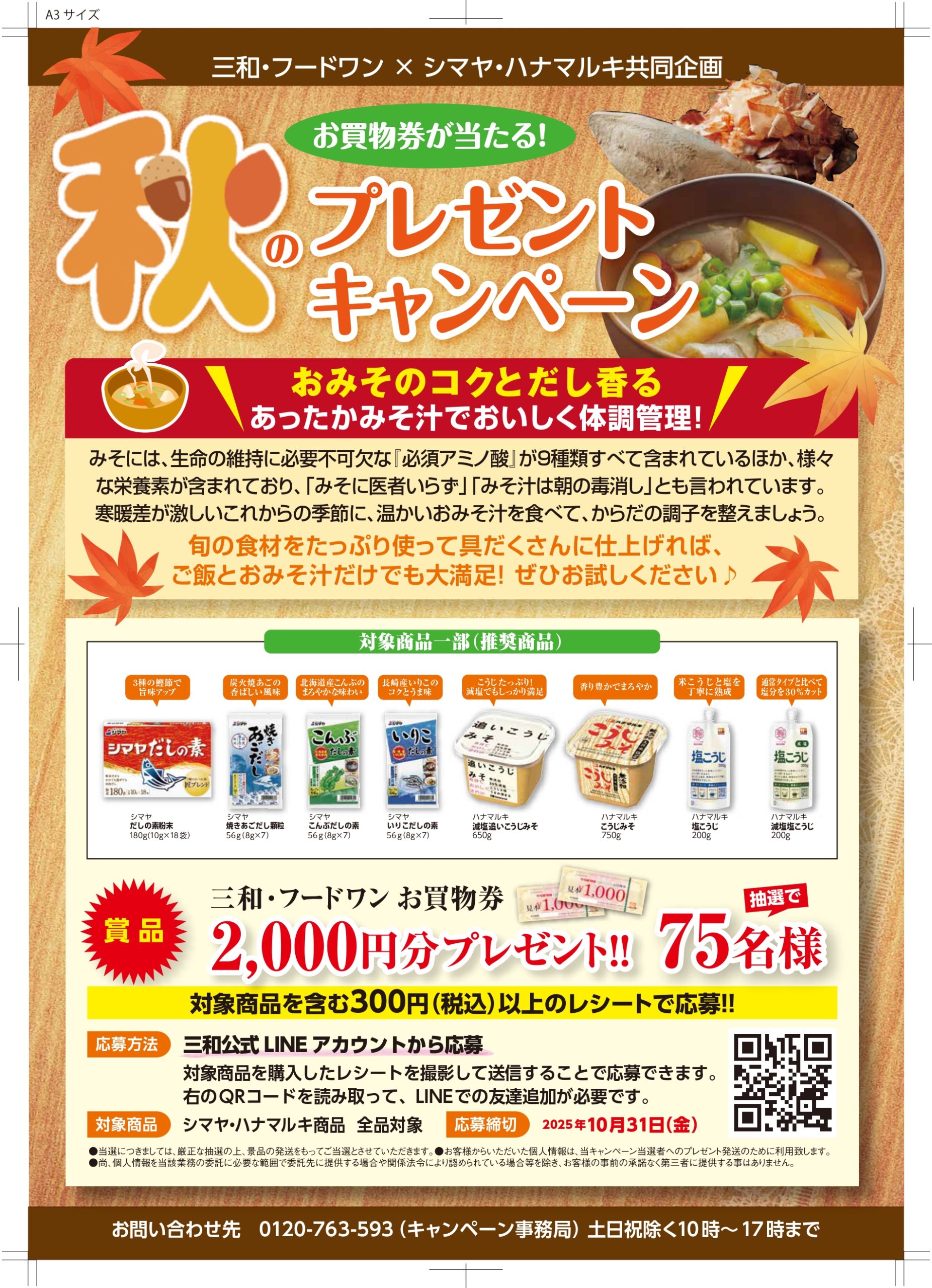三和・フードワン×シマヤ・ハナマルキ共同企画「おいしい!!やさしい!!おみそ汁を飲んで商品券も当てよう!!キャンペーン」