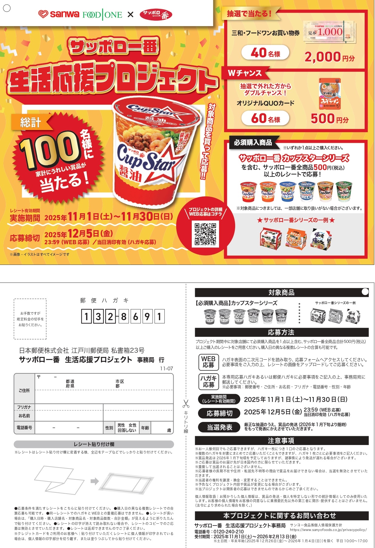 | 応募方法 | プロジェクト期間中に対象店舗にて必須購入商品を1点以上含む、サッポロ一番全商品合計500円(税込)以上ご購入のレシートをご用意ください。購入日の異なる複数レシートの合算も可能です。 WEB応募:ハガキ表面の二次元コードを読み取り、応募フォームへアクセスしてください。必要事項をご入力の上、レシートの画像をアップロードしてご応募ください。 ハガキ応募:本専用応募ハガキあるいは郵便ハガキに必要事項をご記入の上、事務局宛に郵送してください。※必要事項:郵便番号・ご住所・お名前・フリガナ・電話番号・性別・年齢 |