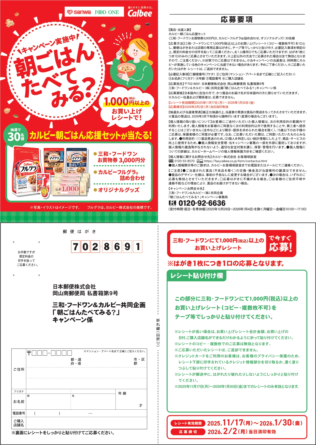 | 応募先 | 〒702-8691 日本郵便株式会社 岡山南郵便局 私書箱第9号 三和・フードワン&カルビー(株)共同企画「朝ごはんたべてみる?」キャンペーン係 |