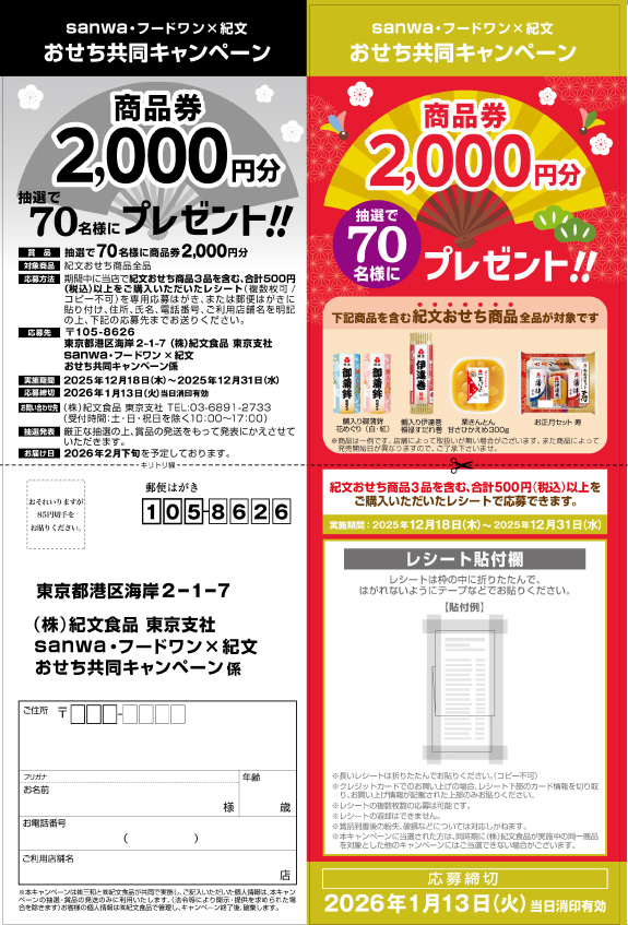 | 応募先 | 〒105-0022 東京都港区海岸2-1-7㈱紀文食品 三和・紀文 おせち共同企画キャンペーン係 |