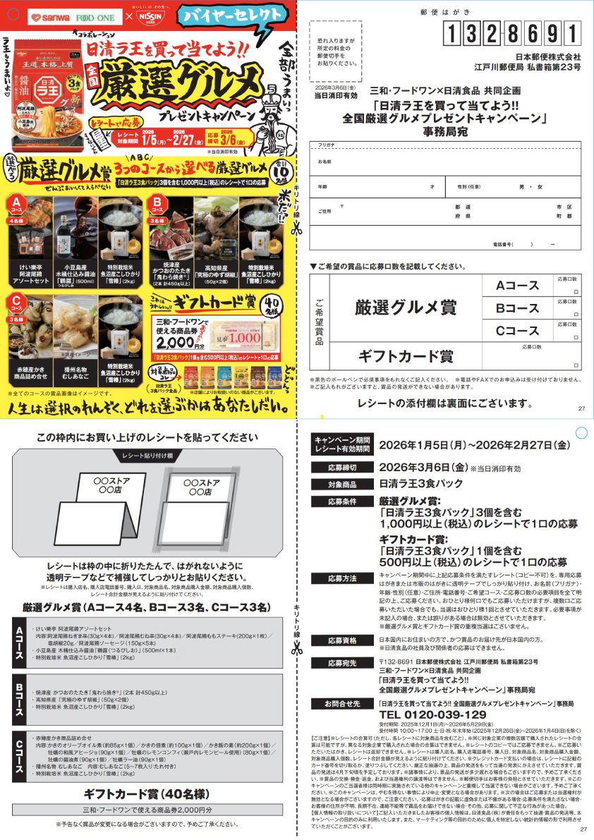 | 応募方法 | 【応募条件】A~Cコース賞:「日清ラ王3食パック」3個を含む1,000円以上(税込)ギフトカード賞:「日清ラ王3食パック」1個を含む500円以上(税込) 【応募方法】キャンペーン期間中に応募条件を満たすレシート(コピー不可)を、専用応募はがきまたは市販のはがきに透明テープでしっかり貼り付け、お名前(フリガナ)・年齢・性別(任意)・ご住所・お電話番号・ご希望コース・ご応募口数の必要項目を全てご記入の上、ご応募ください。 おひとり様何口でもご応募いただけますが、複数口ご応募いただいた場合でも、当選はおひとり様1回までです。必要事項が未記入の場合、または誤りがある場合は無効とさせていただきます。 ※厳選グルメ賞とギフトカード賞の重複当選はございません。 |